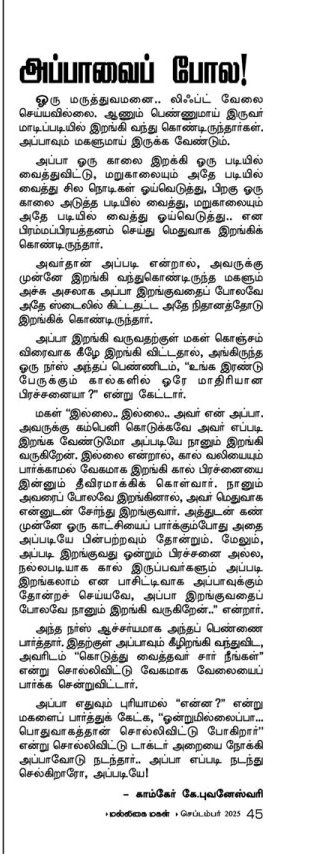 அப்பா எதுவும் புரியாமல் ’என்ன?’ என்று மகளைப் பார்த்து கேட்க ‘ஒன்றுமில்லைப்பா… பொதுவாகத்தான் சொல்லிவிட்டு போகிறார்’ என்று சொல்லிவிட்டு டாக்டர் அறையை நோக்கி இருவரும் நடந்தார்கள். அப்பா எப்படி நடந்து வருகிறாரோ, அப்படியே மகளும்!